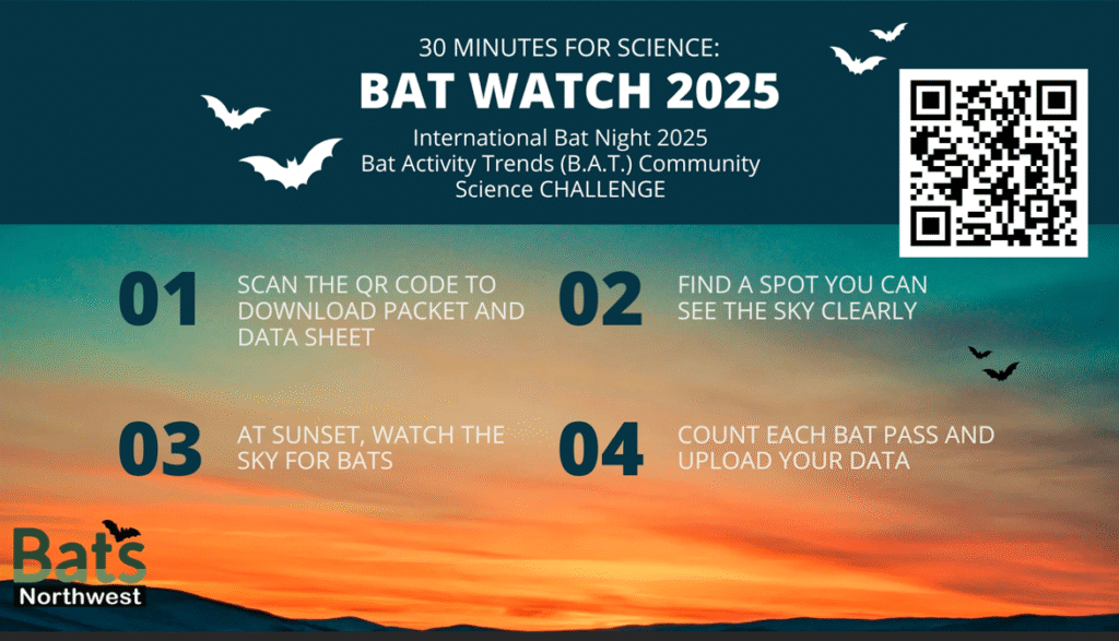 For more information, visit Bats Northwest’s “Bat Count 2025″ webpage. For downloadable resources, easy training videos, and lots more things to help you participate, visit Woodland Park Zoo’s Bat Activity Trends webpage. Inspired? Hankering for more? Get some more Bat Activity Trend events on your calendar!